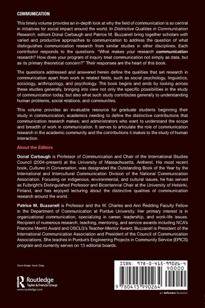 Donal Carbaugh is Professor of Communication and Chair of the International Studies Council (2004-present) at the University of Massachusetts, Amherst. His most recent book, Cultures in Conversation, was designated the Outstanding Book of the Year by the International and Intercultural Communication Division of the National Communication Association. Focusing on indigenous, environmental, and cultural issues, he has served as Fulbright's Distinguished Professor and Bicentennial Chair at the University of Helsinki, Finland, and has enjoyed lecturing about the distinctive qualities of communication research around the world. Patrice M. Buzzanell is professor in the Department of Communication at Purdue University where she earned her Ph.D. in organizational communication. Her research interests center on feminist organizational communication theorizing and the construction of gendered workplace identities, interactions, and structures, particularly as they relate to career processes and outcomes. For her edited book, Rethinking Organizational and Managerial Communication from Feminist Perspectives (Sage, 2000), she received the Central States Communication Association's Theory Book Award in 2002. She also earned the W. Charles Redding Dissertation Award from the International Communication Association in 1988. She has been highly involved in ICA and NCA, as well as the Organization for the Study of Communication, Language and Gender. She will become president of ICA in 2010.