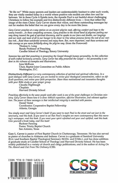 Be like me! While many parents and leaders are understandably hesitant to utter such words, they are vitally needed today in a world where positive role models are often few and far between. Yet in these Cycle A epistle texts, the Apostle Paul is not bashful about challenging Christians to follow his example and live distinctively different lives -- lives that reflect the image of the risen Christ. Gary Carver shares that vision, and these outstanding messages lay out for readers the belief that we can grow every day to be more like Jesus. Gary Carver preaches at a way station on an ancient pilgrim road, offering comfort and hope to the weary traveler.... In these compelling sermons, Gary preaches to the mixed band of pilgrims jostling our way along toward the goal of spiritual discovery, and he speaks to our fears and doubts, our longings and our need, and most of all to our hunger to be closer to one whose presence forms the end of our restless trek.... Read these wonderful sermons and enjoy them. But, more important, read these sermons and take courage as you move faithfully along the pilgrim way. (from the Foreword) Thomas G. Long Bandy Professor of Preaching Candler School of Theology, Emory University Someone has said that preaching is presenting the gospel through human personality. In this collection of well-crafted lectionary sermons, Gary Carver has ably presented the gospel -- his personality is evident in the richness of examples and illustrations. June McEwen Chair, Baptist Joint Committee on Public Affairs Washington DC Distinctively Different is a very contemporary collection of spirited and spiritual reflections. In a quiet dialogue with Gary Carver, you are invited to revive your theological commitments, reflect on difficult questions, and renew your faith perspective. Share these motivational and innovative thoughts with your Bible study or your prayer group. Claudia Highbaugh Chaplain Harvard Divinity School Preaching effectively to the same people week after week is one of the great challenges in Christian ministry. Gary Carver shows how it is done: biblical exposition, effective illustration, and relevant application. The power of these messages is that intellectual integrity is matched with passion. Daniel Vestal Coordinator, Cooperative Baptist Fellowship Atlanta, Georgia You simply must read Gary Carver's book! If you want to meet Paul in the street and not just in the sanctuary, read this book. If you want to see that Paul's insights are more contemporary than this morning's newspaper, read this book. If you want your spirit refreshed and your soul uplifted, read this book. Give yourself a break today, read this book! Buckner Fanning Pastor, Trinity Baptist Church San Antonio, Texas Gary L. Carver is pastor of First Baptist Church in Chattanooga, Tennessee. He has also served as pastor of churches in Alabama and Indiana. Carver is a graduate of Samford University (B.A.) and Southern Baptist Theological Seminary (M.Div. and D.Min.), and has done additional graduate study at Candler School of Theology and Harvard Divinity School. He has been widely published in a variety of church and clergy publications, and is the author of Acting on the Absurd and Out From the Ordinary (CSS).