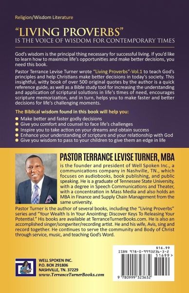 "Living Proverbs" Is the Voice of Wisdom for Contemporary Times. God’s wisdom is the principal thing necessary for successful living. If you’d like to learn how to maximize life’s opportunities and make better decisions, you need this book. Pastor Terrance Levise Turner wrote "Living Proverbs"-Vol.1 to teach God’s principles and help Christians make better decisions in today’s society. This insightful, witty book of over 500 original quotes by the author is a quick reference guide, as well as a Bible study tool for increasing the understanding and application of scriptural solutions in life's times of need, encourages scripture memorization, and in turn, helps you to make faster and better decisions for life's challenging moments. The Biblical wisdom found in this book will help you: make better and faster godly decisions give you comfort and counsel to face life’s challenges inspire you to take action on your dreams and obtain success enhance your understanding of scripture and your relationship with God Give you wisdom to pass to your children to give them an edge in life