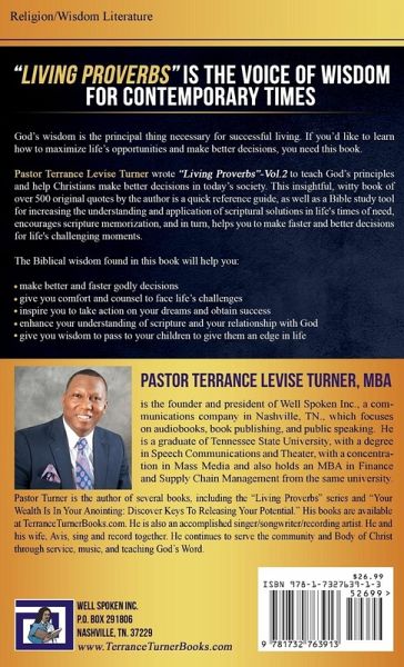 "Living Proverbs" Is the Voice of Wisdom for Contemporary Times God’s wisdom is the principal thing necessary for successful living. If you’d like to learn how to maximize life’s opportunities and make better decisions, you need this book. Pastor Terrance Levise Turner wrote "Living Proverbs"-Vol.2 to teach God’s principles and help Christians make better decisions in today’s society. This insightful, witty book of over 500 original quotes by the author is a quick reference guide, as well as a Bible study tool for increasing the understanding and application of scriptural solutions in life's times of need, encourages scripture memorization, and in turn, helps you to make faster and better decisions for life's challenging moments. The Biblical wisdom found in this book will help you: make better and faster godly decisions give you comfort and counsel to face life’s challenges inspire you to take action on your dreams and obtain success enhance your understanding of scripture and your relationship with God give you wisdom to pass to your children to give them an edge in life