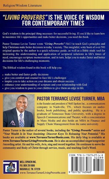 "Living Proverbs" Is the Voice of Wisdom for Contemporary Times. God’s wisdom is the principal thing necessary for successful living. If you’d like to learn how to maximize life’s opportunities and make better decisions, you need this book. Pastor Terrance Levise Turner wrote "Living Proverbs"-Vol.3 to teach God’s principles and help Christians make better decisions in today’s society. The insightful, new material written in this new volume is both relevant and crafted to help you answer your life’s immediate needs, whether it be family issues and relationships, financial challenges, job and business needs, or trying to keep peace of mind in today’s volatile social environment. This edition contains over 530 new, original, God-inspired quotes by the author. The book was written in real-time to reveal God’s heart to His people dealing with today’s real-life concerns. The book is a quick reference guide, as well as a Bible study tool for increasing the understanding and application of scriptural solutions in life's times of need, encourages scripture memorization, and in turn, helps you to make faster and better decisions for life's challenging moments. The Biblical wisdom found in this book will help you: Gain clarity of mind and make better decisions Set goals for the New Year and show you how to achieve them Access wisdom for daily devotionals and daily motivation Obtain the perfect gift for family and friends to enrich their lives Possess a powerful tool for teaching your children godly wisdom