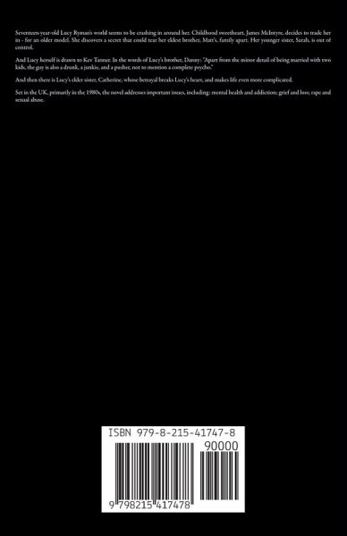 Seventeen-year-old Lucy Ryman's world seems to be crashing in around her. Childhood sweetheart, James McIntyre, decides to trade her in - for an older model. She discovers a secret that could tear her eldest brother, Matt's, family apart. Her younger sister, Sarah, is out of control. And Lucy herself is drawn to Kev Tanner. In the words of Lucy's brother, Danny: "Apart from the minor detail of being married with two kids, the guy is also a drunk, a junkie, and a pusher, not to mention a complete psycho." And then there is Lucy's elder sister, Catherine, whose betrayal breaks Lucy's heart, and makes life even more complicated. Set in the UK, primarily in the 1980s, the novel addresses important issues, including: mental health and addiction; grief and loss; rape and sexual abuse.