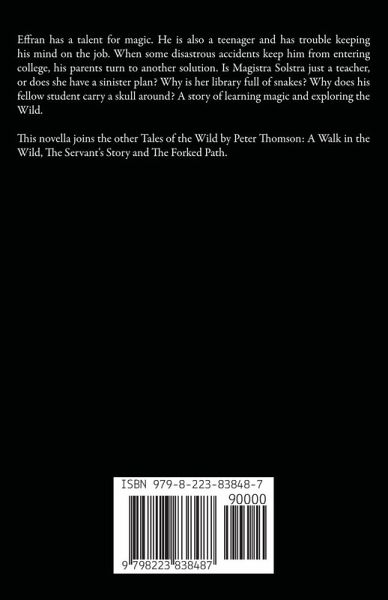 Effran has a talent for magic. He is also a teenager and has trouble keeping his mind on the job. When some disastrous accidents keep him from entering college, his parents turn to another solution. Is Magistra Solstra just a teacher, or does she have a sinister plan? Why is her library full of snakes? Why does his fellow student carry a skull around? A story of learning magic and exploring the Wild. This novella joins the other Tales of the Wild by Peter Thomson: A Walk in the Wild, The Servant's Story and The Forked Path, all available on Amazon.