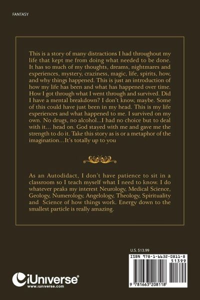 This is a story of many distractions I had throughout my life that kept me from doing what needed to be done. It has so much of my thoughts, dreams, nightmares and experiences, mystery, craziness, magic, life, spirits, how, and why things happened. This is just an introduction of how my life has been and what has happened over time. How I got through what I went through and survived. Did I have a mental breakdown? I don't know, maybe. Some of this could have just been in my head. This is my life experiences and what happened to me. I survived on my own. No drugs, no alcohol...I had no choice but to deal with it... head on. God stayed with me and gave me the strength to do it. Take this story as is or a metaphor of the imagination...It's totally up to you