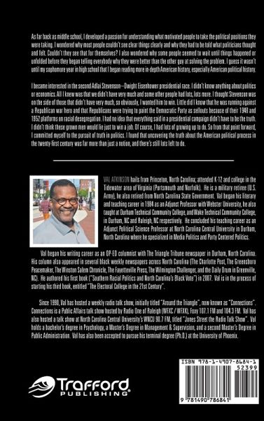 Val Atkinson hails from Princeton, North Carolina; attended K-12 and college in the Tidewater area of Virginia (Portsmouth and Norfolk). He is a military retiree (U.S. Army), he also retired from North Carolina State Government. Val began his literary and teaching career in 1984 as an Adjunct Professor with Webster University, he also taught at Durham Technical Community College, and Wake Technical Community College, in Durham, NC and Raleigh, NC respectively. He concluded his teaching career as an Adjunct Political Science Professor at North Carolina Central University in Durham, North Carolina where he specialized in Media Politics and Party Centered Politics. Val began his writing career as an OP-ED columnist with The Triangle Tribune newspaper in Durham, North Carolina. His column also appeared in several black weekly newspapers across North Carolina (The Charlotte Post, The Greensboro Peacemaker, The Winston Salem Chronicle, The Fayetteville Press, The Wilmington Challenger, and the Daily Drum in Greenville, NC). He authored his first book (Southern Racial Politics and North Carolinas Black Vote) in 2007. Val is in the process of starting his third book, entitled The Electoral College in the 21st Century. Since 1990, Val has hosted a weekly radio talk show, initially titled Around the Triangle, now known as Connections. Connections is a Public Affairs talk show hosted by Radio One of Raleigh (WFXC / WFXK), Foxy 107.1 FM and 104.3 FM. Val has also hosted a talk show at North Carolina Central Universitys WNCU 90.7 FM, titled Jones Street the Radio Talk Show. Val holds a bachelors degree in Psychology, a Masters Degree in Management & Supervision, and a second Masters Degree in Public Administration. Val has also been accepted to pursue his terminal degree (Ph.D.) at the University of Phoenix.