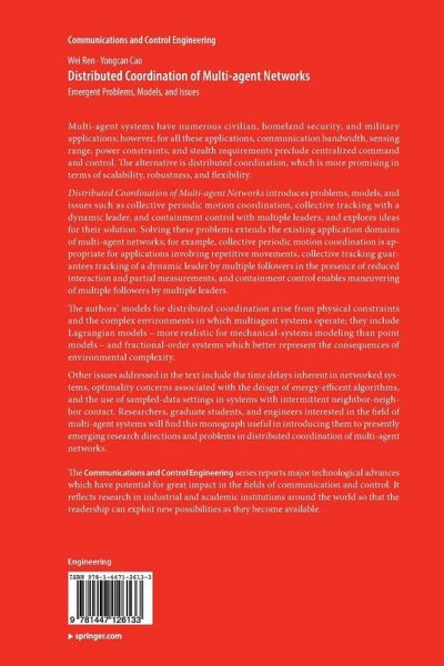 Distributed Coordination of Multi-agent Networks introduces problems, models, and issues such as collective periodic motion coordination, collective tracking with a dynamic leader, and containment control with multiple leaders. Solving these problems extends the existing application domains of multi-agent networks.