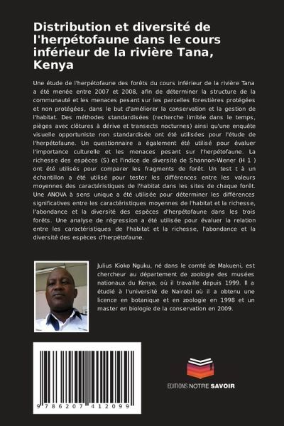 Une étude de l'herpétofaune des forêts du cours inférieur de la rivière Tana a été menée entre 2007 et 2008, afin de déterminer la structure de la communauté et les menaces pesant sur les parcelles forestières protégées et non protégées, dans le but d'améliorer la conservation et la gestion de l'habitat. Des méthodes standardisées (recherche limitée dans le temps, pièges avec clôtures à dérive et transects nocturnes) ainsi qu'une enquête visuelle opportuniste non standardisée ont été utilisées pour l'étude de l'herpétofaune. Un questionnaire a également été utilisé pour évaluer l'importance culturelle et les menaces pesant sur l'herpétofaune. La richesse des espèces (S) et l'indice de diversité de Shannon-Wiener (H 1 ) ont été utilisés pour comparer les fragments de forêt. Un test t à un échantillon a été utilisé pour tester les différences entre les valeurs moyennes des caractéristiques de l'habitat dans les sites de chaque forêt. Une ANOVA à sens unique a été utilisée pour déterminer les différences significatives entre les caractéristiques moyennes de l'habitat et la richesse, l'abondance et la diversité des espèces d'herpétofaune dans les trois forêts. Une analyse de régression a été utilisée pour évaluer la relation entre les caractéristiques de l'habitat et la richesse, l'abondance et la diversité des espèces d'herpétofaune.