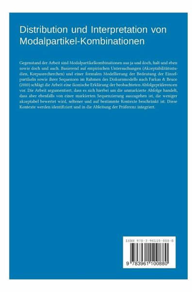 Gegenstand der Arbeit sind Modalpartikelkombinationen aus ja und doch, halt und eben sowie doch und auch. Basierend auf empirischen Untersuchungen (Akzeptabilitätsstudien, Korpusrecherchen) und einer formalen Modellierung der Bedeutung der Einzelpartikeln sowie ihrer Sequenzen im Rahmen des Diskursmodells nach Farkas & Bruce (2010) schlägt die Arbeit eine ikonische Erklärung der beobachteten Abfolgepräferenzen vor. Die Arbeit argumentiert, dass es sich hierbei um die unmarkierte Abfolge handelt, dass aber ebenfalls von einer markierten Sequenzierung auszugehen ist, die weniger akzeptabel bewertet wird, seltener und auf bestimmte Kontexte beschränkt ist. Diese Kontexte werden identifiziert und in die Ableitung der Präferenz integriert. The subject of this piece of work is the combination of the modal particles ja and doch, halt and eben as well as doch and auch. Based on empirical investigation (acceptability studies, corpus searches) and a formal modelling of the meaning of the single particles as well as their sequences within the discourse model by Farkas & Bruce (2010), this work proposes an iconic explanation of the observed sequencing preferences. It is argued that the preferred sequences show the unmarked orders. However, one should act on the assumption that marked sequences exist as well. These are less acceptable, occur more infrequently and are restricted to certain contexts. These contexts are identified and integrated into the explanation of the preferences.