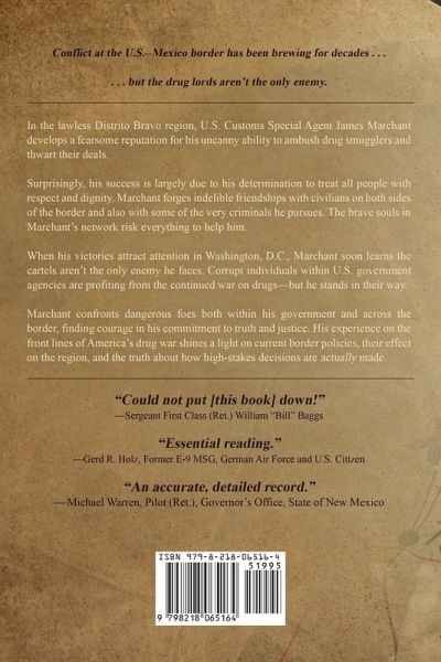 Conflict at the U.S./Mexico border has been brewing for decades . . . . . . but the drug lords aren't the only enemy. In the lawless Distrito Bravo region, U.S. Customs Special Agent James Marchant develops a fearsome reputation for his uncanny ability to ambush drug smugglers and thwart their deals. Surprisingly, his success is largely due to his determination to treat all people with respect and dignity. Marchant forges indelible friendships with civilians on both sides of the border and also with some of the very criminals he pursues. The brave souls in Marchant's network risk everything to help him. When his victories attract attention in Washington, D.C., Marchant soon learns the cartels aren't the only enemy he faces. Corrupt individuals within U.S. government agencies are profiting from the continued war on drugs-but he stands in their way. Marchant confronts dangerous foes both within his government and across the border, finding courage in his commitment to truth and justice. His experience on the front lines of America's drug war shines a light on current border policies, their effect on the region, and the truth about how high-stakes decisions are actually made.