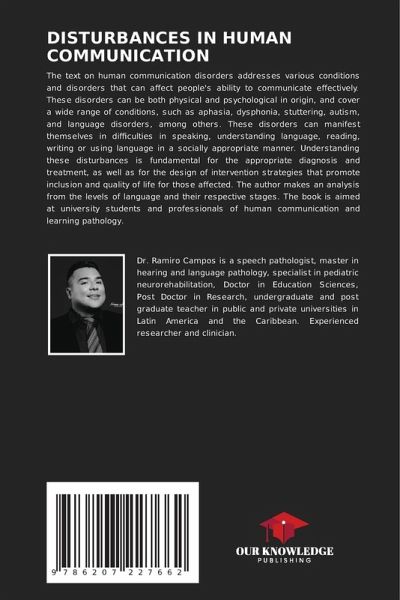The text on human communication disorders addresses various conditions and disorders that can affect people's ability to communicate effectively. These disorders can be both physical and psychological in origin, and cover a wide range of conditions, such as aphasia, dysphonia, stuttering, autism, and language disorders, among others. These disorders can manifest themselves in difficulties in speaking, understanding language, reading, writing or using language in a socially appropriate manner. Understanding these disturbances is fundamental for the appropriate diagnosis and treatment, as well as for the design of intervention strategies that promote inclusion and quality of life for those affected. The author makes an analysis from the levels of language and their respective stages. The book is aimed at university students and professionals of human communication and learning pathology.