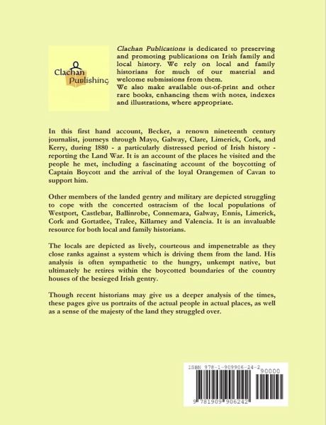 In this invaluable resource for both local and family historians, Becker, a renown nineteenth century journalist, journeys through Mayo, Galway, Clare, Limerick, Cork, and Kerry, during 1880, reporting the Land War. We hear of the places he visited and the people he met, including Captain Boycott. Members of the landed gentry and military are depicted as struggling to cope with the ostracism of the local populations of Westport, Castlebar, Ballinrobe, Connemara, Ennis, and Gortatlee, Tralee, Killarney and Valencia. The locals are depicted as lively, courteous and impenetrable as they close ranks against a system, which is driving them from the land. His analysis is often sympathetic to the hungry, unkempt native Irish, but ultimately he retires within the boycotted boundaries of the country houses of the besieged Irish gentry. Clachan editors have edited it carefully, updating certain disused symbols, spelling and punctuation. We have also provided an index and scholarly footnotes.