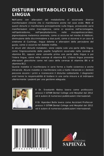 Nell'uomo con alterazioni del metabolismo si osservano diverse manifestazioni cliniche che si manifestano anche nel cavo orale. Molti di questi disturbi si manifestano principalmente sulla lingua, provocando varie manifestazioni come macroglossia, come si osserva nell'acromegalia, nell'ipotiroidismo, nell'iperpituitarismo, nelle mucopolisaccaridosi, pigmentazione melaninica anomala, come si osserva nel morbo di Addison, diminuzione della discriminazione a due punti, come si osserva in un caso di sindrome di Cushings, lingua dolente e alterazioni della percezione del gusto, come si osserva nel diabete mellito.In alcuni altri disturbi metabolici, viene colpita solo una parte della lingua, come l'ingrossamento delle papille fungiformi osservato nella carenza di vitamina B1, oppure viene coinvolta prima una parte della lingua e poi l'intera lingua, come nella carenza di vitamina B2. L'intera lingua presenta alterazioni glossitiche come nel caso della carenza di vitamina B6 e di vitamina B12.Queste malattie si manifestano in varie forme a livello sistemico e anche intraorale. Alcune malattie si manifestano solo a livello intraorale e i dentisti possono essere i primi a riconoscere il disturbo sottostante. I diagnostici orali hanno la responsabilità di trattare in una certa misura e di indirizzare ulteriormente i pazienti per una gestione adeguata.