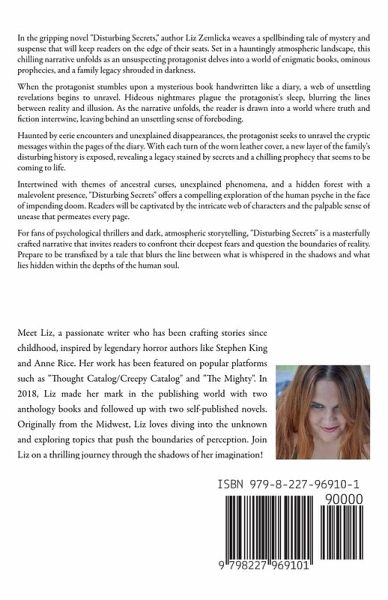 In the gripping novel "Disturbing Secrets," author Liz Zemlicka weaves a spellbinding tale of mystery and suspense that will keep readers on the edge of their seats. Set in a hauntingly atmospheric landscape, this chilling narrative unfolds as an unsuspecting protagonist delves into a world of enigmatic books, ominous prophecies, and a family legacy shrouded in darkness. When the protagonist stumbles upon a mysterious book handwritten like a diary, a web of unsettling revelations begins to unravel. Hideous nightmares plague the protagonist's sleep, blurring the lines between reality and illusion. As the narrative unfolds, the reader is drawn into a world where truth and fiction intertwine, leaving behind an unsettling sense of foreboding. Haunted by eerie encounters and unexplained disappearances, the protagonist seeks to unravel the cryptic messages within the pages of the diary. With each turn of the worn leather cover, a new layer of the family's disturbing history is exposed, revealing a legacy stained by secrets and a chilling prophecy that seems to be coming to life. Intertwined with themes of ancestral curses, unexplained phenomena, and a hidden forest with a malevolent presence, "Disturbing Secrets" offers a compelling exploration of the human psyche in the face of impending doom. Readers will be captivated by the intricate web of characters and the palpable sense of unease that permeates every page. For fans of psychological thrillers and dark, atmospheric storytelling, "Disturbing Secrets" is a masterfully crafted narrative that invites readers to confront their deepest fears and question the boundaries of reality. Prepare to be transfixed by a tale that blurs the line between what is whispered in the shadows and what lies hidden within the depths of the human soul.