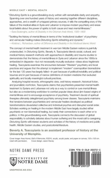 This book investigates the psychological toll of conflict in the Middle East during the twentieth century, including discussion of how spiritual and religious frameworks influence practice and theory. The concept of mental health treatment in war-torn Middle Eastern nations is painfully understudied. In Disturbing Spirits, Beverly A. Tsacoyianis blends social, cultural, and medical history research methods with approaches in disability and trauma studies to demonstrate that the history of mental illness in Syria and Lebanon since the 1890s is embedded in disparate-but not necessarily mutually exclusive-ideas about legitimate healing. Tsacoyianis examines the encounters between "Western" psychiatry and local practices and argues that the attempt to implement "modern" cosmopolitan biomedicine for the last 120 years has largely failed-in part because of political instability and political traumas and in part because of narrow definitions of modern medicine that excluded spirituality and locally meaningful cultural practices. Analyzing hospital records, ethnographic data, oral history research, historical fiction, and journalistic nonfiction, Tsacoyianis claims that psychiatrists presented mental health treatment to Syrians and Lebanese not only as a way to control or cure mental illness but also as a modernizing worldview to combat popular ideas about jinn-based origins of mental illness and to encourage acceptance of psychiatry. Treatment devoid of spiritual therapies ultimately delegitimized psychiatry among lower classes. Tsacoyianis maintains that tensions between psychiatrists and vernacular healers developed as political transformations devastated collective and individual psyches and disrupted social order. Scholars working on healing in the modern Middle East have largely studied either psychiatric or non-biomedical healing, but rarely their connections to each other or to politics. In this groundbreaking work, Tsacoyianis connects the discussion of global responsibility to scholarly debates about human suffering and the moral call to caregiving. Disturbing Spirits will interest students and scholars of the history of medicine and public health, Middle Eastern studies, and postcolonial literature.
