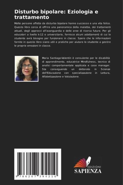 Molte persone affette da disturbo bipolare hanno successo e una vita felice. Questo libro cerca di offrire una panoramica della malattia, dei trattamenti attuali, degli approcci all'avanguardia e delle aree di ricerca future. Per gli educatori a livello k-12 o universitario, fornisce alcuni adattamenti di cui lo studente avrà bisogno per funzionare in classe. Spero che le informazioni fornite in questo libro siano utili e pratiche per aiutare lo studente a gestire le proprie emozioni in classe.