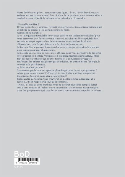 Votre décision est prise... retrouver votre ligne... bravo ! Mais faut-il encore résister aux tentations et tenir bon ! Le but de ce guide est donc de vous aider à atteindre votre objectif de minceur sans privation ni frustration... De quelle manière ?1/ Il vous donne force, courage, fermeté et motivation...2/ vous conseille (entre autres)... Mais son contenu principal est constitué de prières à lire certains jours du mois.Comment çà marche ?1/ en invoquant au préalable votre ange gardien (si vous ne connaissez pas son nom, un tableau récapitulatif pour permettra de « faire sa connaissance »), ensuite ses frères spécialisés et surtout les anges experts dans la lutte contre les mauvaises habitudes alimentaires, pour la persévérance et la ténacité (entre autres).2/ Sans oublier le pouvoir incontestable des archanges et esprits de la nature pour vous encourager chaque jour, et si cela fait partie de votre religion, d'invoquer les saints.3/ S'ajoute une technique facile mais efficace pour vous permettre de déployer votre puissance mentale (visualisation et autosuggestion entre autres,) pour résister aux tentations... Encore faut-il connaître les bonnes formules. Ces puissants préceptes renforcent les prières et agissent par conviction, en transmettant l'énergie, la volonté et la persévérance.4/ Mais ce n'est pas tout !Savez-vous que l'influence de la lune occupe une place importante dans ce programme ? Alors, pour un maximum d'efficacité, je vous invite à utiliser son pouvoir incontesté. Rassurez-vous, rien de compliqué ! Il vous suffit de vous munir de 2 calendriers de l'année en cours sur lequel les lunes sont répertoriées, ce guide et quelques minutes de votre temps. En vous référant à ses cycles d'influence, vous aurez la confiance non seulement de perdre du poids, mais avant tout de ne pas le reprendre !5/puis en fin de volume, vous trouverez un pentagramme à découper et à remplir... (Bien respecter le jour de la semaine). - Ainsi, à l'aide de cette méthode vous ne perdrez plus votre temps à lutter seul.e sans soutien ni repères ou en investissant des sommes astronomiques dans des programmes qui, une fois achevés, vous ramènent au point de départ !Croyez en vous-même, mais surtout en la puissance de l' UNIVERS. Cette force serviable et... gratuite.- Demandez et... obtenez de très bons résultats !