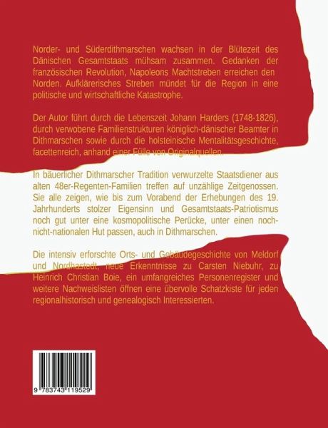 Norder- und Süderdithmarschen wachsen in der Blütezeit des Dänischen Gesamtstaats im 18. Jahrhundert mühsam zusammen. Dann erreichen das Gedankengut der französischen Revolution und Napoleons Machtstreben den hohen Norden. Das aufklärerische Streben nach einer besseren Welt mündet für die Region in eine politische und wirtschaftliche Katastrophe. Eine umfangreiche Dithmarscher Wirtschafts-, Zeit- und Ortsgeschichte, vom spätbarocken Pietismus über Aufklärung und "Franzosentid" bis zum restaurativen Biedermeier. Lokale Geschichte wird ausführlich in seiner wirtschaftlichen, familiären und geistigen Wechselwirkung zum holsteinischen Umland und den Verwaltungsstrukturen des dänischen Gesamtstaates dargestellt. Der Autor führt durch das Leben des Kirchspielvogts Johann Harders (1748-1826), faktenreich und mit einer Fülle von Originalquellen. Tief in der bäuerlichen Dithmarscher Tradition und den alten 48er Regentenfamilien verwurzelte Staatsdiener treffen auf unzählige Zeitgenossen und holsteinische Mentalitätsgeschichte. Sie alle zeigen, wie auch in Dithmarschen bis zum Vorabend der Erhebungen des 19. Jahrhunderts stolzer Eigensinn und Gesamtstaatspatriotismus noch gut unter eine kosmopolitische Perücke und einen noch-nicht-nationalen Hut passen. Mit seiner intensiv erforschten Orts- und Gebäudegeschichte von Meldorf und Nordhastedt (es wird zeitweise zu einem echten Landespolitikum), neuen Erkenntnissen zu Carsten Niebuhr und Heinrich Christian Boie, einem umfangreichen Personenregister mit über 1.000 Namen eine übervolle Schatzkiste für jeden regionalhistorisch und genealogisch Interessierten.