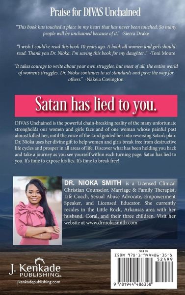 DIVAS Unchained is the powerful chain-breaking reality of the many unfortunate strongholds our women and girls face and of one woman whose painful past almost killed her, until the voice of the Lord guided her into reversing Satan’s plan. Dr. Nioka uses her divine gift to help women and girls break free from destructive life cycles and prosper in all areas of life. Discover what has been holding you back and take a journey as you see yourself within each turning page. Satan has lied to you. It’s time to expose his lies. It’s time to break free!