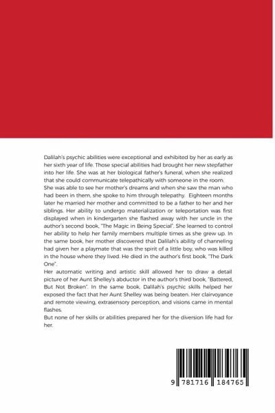 Dalilah's psychic abilities were exceptional and exhibited by her as early as her sixth year of life. Those special abilities had brought her new stepfather into her life. She was at her biological father's funeral when she realized that she could communicate telepathically with someone in the room, other than her mother. She was able to see her mother's dreams and when she saw the man who had been in them, she spoke to him through telepathy. Eighteen months later he married her mother and committed to be a father to her and her siblings. Her ability to undergo materialization, disappearance or teleportation was first displayed in the author's second book, "The Magic in Being Special". In the same book, her mother discovered that Dalilah's ability of channeling had given her a playmate that was the spirit of a little boy, who was killed in the house where they lived. He died in the author's first book, "The Dark One". Her exception artistic skills allowed her to draw a detail picture of her Aunt Shelley's abductor in the author's third book, "Battered, But Not Broken". In the same book, Dalilah's psychic skills helped her exposed the fact that her Aunt Shelley was being beaten when she touched her bruises. With her clairvoyance and remote viewing skills, she could see or have vision in mental flashes that included pictures of people, scenes, objects, spirits or symbols and colors. But none of her skills or abilities foretold of the diversions life had planned for her.