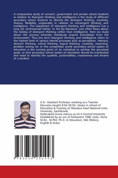 A comparative study of convent, government and private school students in relation to divergent thinking and intelligence is the study of different secondary school students to identify the divergent thinking, creativity, fluency, flexibility, origionality in relation to convergent thinking and intelligence. The assessment of divergent thinking and intelligence has a long yet controversial matter. In the lay literature, one often hears about the testing of divergent thinking rather than intelligence. Here we study about the process whereby individuals acquire knowledge from the environment. Thus the term divergent thinking and intelligence refers to the highest level of various mental processes such as perception, memory, abstract thinking, critical thinking, logical thinking, creativity, reasoning, problem solving etc In this competitive world secondary school system of education is the turning point of an individual to achieve the perceived goals, so that secondary school system of education should be overlooked and need to identify the qualities, potentialities, creativeness and dreams of a student.