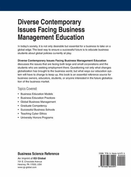 In today's society, it is not only desirable but essential for a business to take on a global edge. The best way to ensure a successful future is to educate business students about global policies currently at play. Diverse Contemporary Issues Facing Business Management Education discusses the issues that are facing both large and small corporations and the students who are seeking employment there. Questioning not only what changes globalization has brought to the business world, but what ways our education system will have to change to keep up, this book is an essential reference source for business owners, educators, students, or anyone interested in the future globalization of the business market.