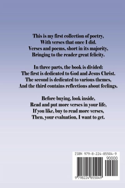 This is my first collection of poetry, With verses that once I did. Verses and poems, short in its majority, Bringing to the reader great felicity. In three parts, the book is divided: The first is dedicated to God and Jesus Christ. The second is dedicated to various themes, And the third contains reflections about feelings. Before buying, look inside, Read and put more verses in your life, If you like, buy to read more verses, Then, your evaluation, I want to get.