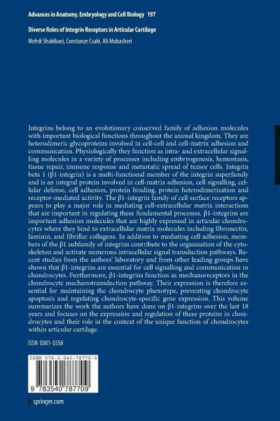 Integrins belong to an evolutionary conserved family of adhesion molecules with important biological functions throughout the animal kingdom. They are heterodimeric glycoproteins involved in cell-cell and cell-matrix adhesion and communication. Physiologically they function as intra- and extracellular signalling molecules in a variety of processes including embryogenesis, hemostasis, tissue repair, immune response and metastatic spread of tumor cells. Integrin beta 1 (ß1-integrin) is a multi-functional member of the integrin superfamily and is an integral protein involved in cell-matrix adhesion, cell signalling, cellular defense, cell adhesion, protein binding, protein heterodimerization and receptor-mediated activity. The ß1-integrin family of cell surface receptors appears to play a major role in mediating cell-extracellular matrix interactions that are important in regulating these fundamental processes. ß1-integrins are important adhesion molecules that are highly expressed in articular chondrocytes where they bind to extracellular matrix molecules including fibronectin, laminin, and fibrillar collagens. In addition to mediating cell adhesion, members of the ß1 subfamily of integrins contribute to the organisation of the cytoskeleton and activate numerous intracellular signal transduction pathways. Recent studies from the authors' laboratory and from other leading groups have shown that ß1-integrins are essential for cell signalling and communication in chondrocytes. Furthermore, ß1-integrins function as mechanoreceptors in the chondrocyte mechanotransduction pathway. Their expression is therefore essential for maintaining the chondrocyte phenotype, preventing chondrocyte apoptosis and regulating chondrocyte-specific gene expression. This book volume summarizes the work that the authors have done on ß1-integrins over the last 18 years and focuses on the expression and regulation of these proteins in chondrocytes and their role in the context ofthe unique function of chondrocytes within articular cartilage.