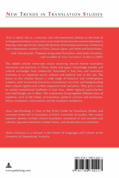 CONTENTS: Nana Sato-Rossberg/Akiko Uchiyama: Introduction - Peter Kornicki: The Origins and Development of Translation Traditions in Pre-Modern East Asia - Sharon Tzu-yun Lai: Erasing the Translators: A History of Pirated Translation in Taiwan, 1949-1987 - Nana Sato-Rossberg: The Emergence of Translation Studies in Japan in the 1970s - Akiko Uchiyama: Translating as Writing: Wakamatsu Shizuko's Empathetic Translation as a Creative Literary Art - Theresa Hyun: Translating/Transforming Women in North Korea: Traditions, Foreign Correspondences and the Creation of the Socialist Woman in the 1950s and 1960s - Thomas Kabara: The Cultures of Professional Subtitling and Fansubbing: Tradition and Innovation in Audiovisual Translation in Japan - Yeong-ae Yamashita: A Gender-Based Analysis of the Translation of South Korean TV Dramas in Japan - Xiaochun Zhang/Minako O'Hagan: Transcreation in Game Localization in China: A Contemporary Functionalist Approach to Digital Interactive Entertainment