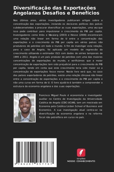 Nos últimos anos, vários investigadores publicaram artigos sobre a concentração das exportações, instando os decisores políticos dos países subdesenvolvidos a procurar diversificar as suas exportações, uma vez que isso pode contribuir para impulsionar o crescimento do PIB per capita. Investigadores como Imbs e Wacziarg (2003) e Hesse (2008) encontraram uma relação não linear em forma de U entre a concentração das exportações e o crescimento do PIB per capita em vários países não produtores de petróleo em todo o mundo. A fim de investigar esta relação, para o caso de Angola, foi aplicado um modelo de regressão do crescimento utilizando o estimador OLS com dados de séries temporais de 1995 a 2011. Angola é um país produtor de petróleo com uma das maiores concentrações de exportações do mundo, e verificámos que a maior concentração de exportações tem sido prejudicial para o crescimento do PIB per capita, tendo em conta que este crescimento teria sido maior se a concentração de exportações fosse menor. Neste livro verá que, no caso dos países exportadores de petróleo, existe uma relação côncava não linear entre a concentração de exportações e o crescimento do PIB per capita e não uma curva em forma de U. O livro ajudá-lo-á também a compreender a estrutura da economia angolana e das suas exportações.