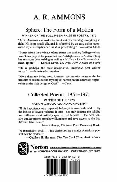 The poems are on a diversity of subjects, but through them all runs the strong unity of vision that has led critic Geoffrey Hartman to acclaim Ammons as "a major American poet" (New York Times Book Review). "If his importance was suspected before," wrote the poet John Ashbery in The New York Review of Books, "it is now confirmed." Ammons came late to poetry, and has come even more lately into national recognition. That recognition is solid, however, and can only be increased by this, his latest volume.
