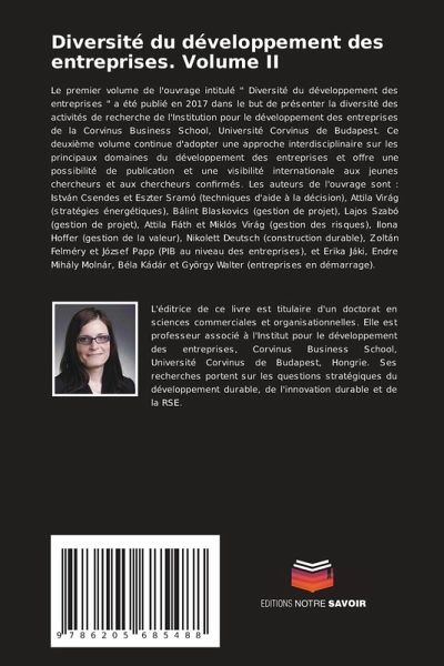Le premier volume de l'ouvrage intitulé " Diversité du développement des entreprises " a été publié en 2017 dans le but de présenter la diversité des activités de recherche de l'Institution pour le développement des entreprises de la Corvinus Business School, Université Corvinus de Budapest. Ce deuxième volume continue d'adopter une approche interdisciplinaire sur les principaux domaines du développement des entreprises et offre une possibilité de publication et une visibilité internationale aux jeunes chercheurs et aux chercheurs confirmés. Les auteurs de l'ouvrage sont : István Csendes et Eszter Sramó (techniques d'aide à la décision), Attila Virág (stratégies énergétiques), Bálint Blaskovics (gestion de projet), Lajos Szabó (gestion de projet), Attila Fiáth et Miklós Virág (gestion des risques), Ilona Hoffer (gestion de la valeur), Nikolett Deutsch (construction durable), Zoltán Felméry et József Papp (PIB au niveau des entreprises), et Erika Jáki, Endre Mihály Molnár, Béla Kádár et György Walter (entreprises en démarrage).