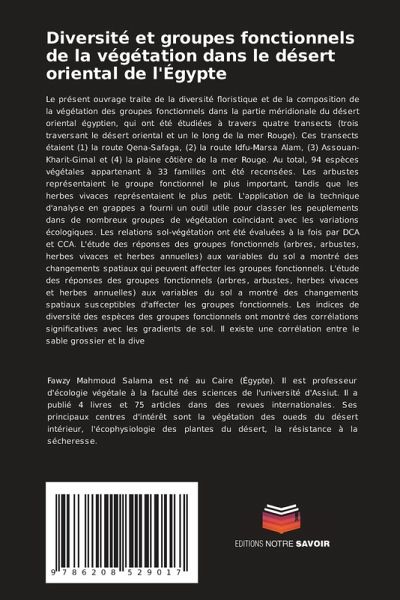 Le présent ouvrage traite de la diversité floristique et de la composition de la végétation des groupes fonctionnels dans la partie méridionale du désert oriental égyptien, qui ont été étudiées à travers quatre transects (trois traversant le désert oriental et un le long de la mer Rouge). Ces transects étaient (1) la route Qena-Safaga, (2) la route Idfu-Marsa Alam, (3) Assouan-Kharit-Gimal et (4) la plaine côtière de la mer Rouge. Au total, 94 espèces végétales appartenant à 33 familles ont été recensées. Les arbustes représentaient le groupe fonctionnel le plus important, tandis que les herbes vivaces représentaient le plus petit. L'application de la technique d'analyse en grappes a fourni un outil utile pour classer les peuplements dans de nombreux groupes de végétation coïncidant avec les variations écologiques. Les relations sol-végétation ont été évaluées à la fois par DCA et CCA. L'étude des réponses des groupes fonctionnels (arbres, arbustes, herbes vivaces et herbes annuelles) aux variables du sol a montré des changements spatiaux qui peuvent affecter les groupes fonctionnels. L'étude des réponses des groupes fonctionnels (arbres, arbustes, herbes vivaces et herbes annuelles) aux variables du sol a montré des changements spatiaux susceptibles d'affecter les groupes fonctionnels. Les indices de diversité des espèces des groupes fonctionnels ont montré des corrélations significatives avec les gradients de sol. Il existe une corrélation entre le sable grossier et la dive