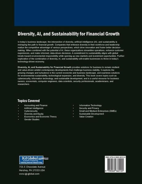 In today's business landscape, the intersection of diversity, artificial intelligence (AI), and sustainability is reshaping the path to financial growth. Companies that embrace diversity in their workforce and leadership realize the competitive advantage of various perspectives, which drive innovation and foster better decision-making. When combined with the potential of AI, these organizations streamline operations, enhance customer experiences, and make informed, data-driven decisions. A commitment to sustainability aligns with global trends toward environmental responsibility while opening up new markets and investment opportunities. Further exploration of the combination of diversity, AI, and sustainability will enable businesses to thrive in today's technology-driven economy. Diversity, AI, and Sustainability for Financial Growth provides solutions for business to remain resilient and value-driven amidst contemporary developments that challenge business stability. It explores the growing changes and turbulence in the current economic and business landscape, and examines solutions for environmental sustainability, technological expansion, and diversity. This book covers topics such as cybersecurity, information technology, and sustainable development, and is a useful resource for business owners, economists, computer engineers, data scientists, security professionals, academicians, and researchers.