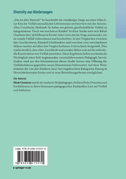 "Das ist alles Mensch!" So beschreibt ein vierjähriger Junge aus einer Münchner Kita die Vielfalt menschlicher Lebensweisen im Interview mit der Autorin. Alter, Geschlecht, Herkunft: So haben wir gelernt, gesellschaftliche Vielfalt zu kategorisieren. Doch wie machen es Kinder? In ihrer Studie setzt sich Rihab Chaabane über 38 bildbasierte Kinder-Interviews mit der Frage auseinander, wie sie soziale Vielfalt wahrnehmen und beschreiben. In den Vergleichen zwischen den Geschlechtern, Kita- und Schulkindern und zwischen zwei verschiedenen Milieus werden auf allen drei Vergleichsebenen Unterschiede festgestellt. Dies macht deutlich, dass Alter, Geschlecht und soziales Milieu sich auf die individuelle Konstruktion von Vielfalt auswirken. Diese Ergebnisse heben nochmals die Wichtigkeit einer früh beginnenden vorurteilsbewussten Pädagogik hervor. Zudem wird aus den Erkenntnissen dieser Studie heraus eine Öffnung der Vielfaltsdiskurse gegenüber neuen Dimensionen befürwortet. Auf diese Weisekönnten die von den Kindern (neu) hervorgebrachten Kategorien Einzug in Diversitätskonzepte finden und so neue Betrachtungsebenen ermöglichen.