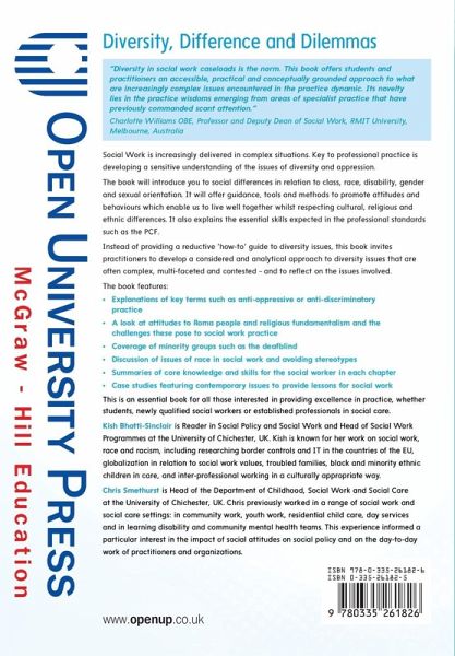 Kish Bhatti-Sinclair is Reader in Social Policy and Social Work and Head of Social Work Programmes at the University of Chichester, UK. Kish is known for her work on social work, race and racism, including researching border controls and IT in the countries of the EU, globalisation in relation to social work values, troubled families, black and minority ethnic children in care, and inter-professional working in a culturally appropriate way. Chris Smethurst is Head of the Department of Childhood, Social Work and Social Care at the University of Chichester, UK. Prior to a career in Higher Education, Chris worked in a range of social work and social care settings: in community work, youth work, residential child care, day services and in learning disability and community mental health teams. This experience informed a particular interest in the impact of social attitudes on social policy and on the day-to-day work of practitioners and organisations. Social Work is increasingly delivered in complex situations. Key to professional practice is developing a sensitive understanding of the issues of diversity and oppression. The book will introduce you to social differences in relation to class, race, disability, gender and sexual orientation. It will offer guidance, tools and methods to promote attitudes and behaviours which enable us to live well together whilst respecting cultural, religious and ethnic differences. It also explains the essential skills expected in the professional standards such as the PCF. Instead of providing a reductive 'how-to' guide to diversity issues, this book invites practitioners to develop a considered and analytical approach to diversity issues that are often complex, multi-faceted and contested - and to reflect on the issues involved. The book features: ¿ Explanations of key terms such as anti-oppressive or anti-discriminatory practice ¿ An understanding of class assumptions and prejudice ¿ A look at attitudes to Roma people and religious fundamentalism and the challenges these pose to social work practice ¿ Coverage of minority groups such as the deafblind ¿ Discussion of issues of race in social work and avoiding stereotypes ¿ Summaries of core knowledge and skills for the social worker in each chapter ¿ Case studies featuring contemporary issues to provide lessons for social work This is an essential book for all those interested in providing excellence in practice, whether students, newly qualified social workers or established professionals in social care. *** This book forms part of the Social Work Skills in Practice series. The series focuses on key social work skills required for working with children and adult service users, families and carers. The books offer both theoretical and evidence-informed knowledge, alongside the application of skills relevant for day-to-day social work practice. They are an invaluable resource for pre-qualifying students, newly-qualified social workers, academics teaching and researching in the field, as well as social work practitioners, including practice educators, pursuing continuous professional development.