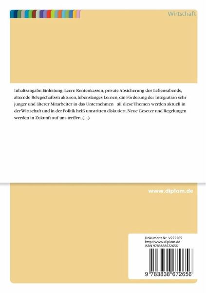 Leere Rentenkassen, private Absicherung des Lebensabends, alternde Belegschaftsstrukturen, lebenslanges Lernen, die Förderung der Integration sehr junger und älterer Mitarbeiter in das Unternehmen all diese Themen werden aktuell in der Wirtschaft und in der Politik heiß umstritten diskutiert. Neue Gesetze und Regelungen werden in Zukunft auf uns treffen. Besonders die Unternehmen werden davon betroffen, die die neuen Herausforderungen aufgrund der demographischen Veränderungen zu Nutze ziehen können und müssen, um weiterhin am nationalen und internationalen Markt wettbewerbsfähig bleiben zu können.
