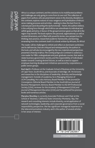 Introduction: The Multi-Faceted Continent; K.April & M.Shockley Rethinking Leadership and Wealth Creation in Africa; L.Mbigi The Art of Western Management in Africa; N.M.Theimann & K.April Understanding Culture-Based Diversity; L.van der Colff Managing Cultural Diversity; L.Booysen The Lions Mark Their Territory: African Thought System; N.M.Theimann Facilitating Paradox; L.De Wet Contributions of Women to the Process of Development and Unity in Africa; M.Mkunu Social Identity Changes: Challenges Facing Leadership; L.Booysen The Hunter's Spirit in Leadership: An African Wounded Soul Theory Perspective; L.Mbigi South African Market Labour Trends: An Analysis of 1995 and 1999 Labour Statistics; H.Bhorat Setting the Transformation Example Through People Potential Best Practice: Kumba Resources; R.Verster Within Country Diversity; S.Burgess Gender and Higher Education in Africa; M.Dunne & Y.Sayed Diversity Challenges in Community; L.Matemba Road to Wellness: Human-Scale Developments for Boosting 'Community Immunity' to HIV/AIDS; J.Clarke Conclusion: A Diverse Africa