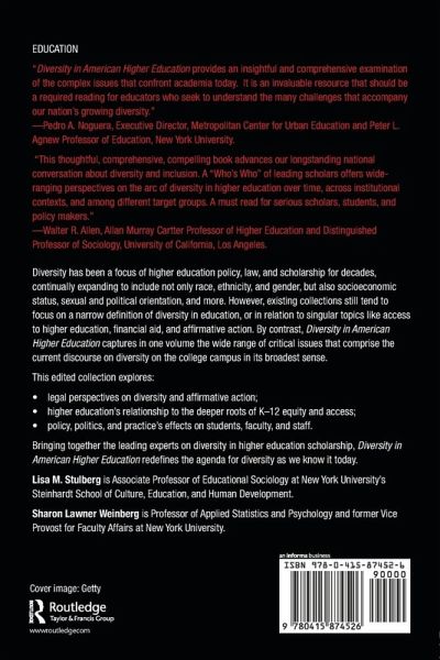 Introduction, Lisa M. Stulberg and Sharon Lawner Weinberg I. The K-12 Pipeline: Impacts on Educational Equity 1. Ethnic and Social Class Disparities in Academic Skills: Their Origins and Consequences, Meredith Phillips 2. Inside the K-12 Pipeline for Black and Latino Students, Amanda E. Lewis and Michelle J. Manno 3. Testing, No Child Left Behind, and Educational Equity, Linda Darling-Hammond II. The Diversity Imperative: Postsecondary Institutional and Legal Ramifications 4. A Long View on "Diversity": A Century of American College Admissions Debates, Lisa M. Stulberg and Anthony S. Chen 5. The Diversity Imperative in Elite Admissions, Mitchell L Stevens and Josipa Roksa 6. The Diversity Rationale: Its Limitations for Educational Practice, Mitchell J. Chang and María C. Ledesma 7. The Official Organization of Diversity in American Higher Education: A Retreat from Race? anthony lising antonio and Chris Gonzalez Clarke Section III. Understanding Progress and Continuing Challenges in American Higher Education 8. Trends in the Education of Underrepresented Racial Minority Students, Peter Teitelbaum 9. Gender Equity in Higher Education, Claudia Buchmann and Thomas A. DiPrete 10. LGBT Students, Faculty, and Staff: Past, Present, and Future Directions , Debbie Bazarsky and Ronni Sanlo 11. Identifying Talent, Interrupting the Usual: Diversifying the Faculty, Daryl G. Smith 12. Asian Americans and Diversity Talk: The Limits of the Numbers Game, Dana Takagi 13. Conservative Critics and Conservative College Students: Variations in Discourses of Exclusion, Amy J. Binder and Kate Wood 14. Explaining Professors' Politics: Is It a Matter of Self-Selection? Neil Gross and Catherine Cheng 15. Experiences of Exclusion and Marginalization: A Study at the Individual Student Level, Bonita London, Vanessa Anderson, and Geraldine Downey IV. Future Implications for Diversity: Practice, Policy, and the Law 16. HBCUs: Continued Relevance in the New Century, Sarah Willie-LeBreton 17. The Role of Women's Colleges in the 21st Century, Leslie Miller-Bernal 18. The New Financial Aid Policies: Their Impact on Access and Equity for Low-Income Students, Bridget Terry Long 19. Improving Assessments of Faculty Diversity, Sharon Lawner Weinberg 20. New Legal Perspectives: Implications for Diversity in the Post-Grutter Era, Lia Epperson