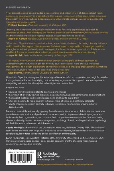 Diversity in Organizations argues that ensuring a diverse workforce composition has tangible benefits for organizations. Rather than relying on touchy-feely arguments, Herring and Henderson present compelling evidence that directly links diversity to the bottom line. Readers will learn: How and why diversity is related to business performance The impact of diversity training programs on productivity, business performance and promotions The biggest mistakes in diversity management, and how to avoid them What can be done to make diversity initiatives more effective and politically palatable How to measure success in diversity initiatives in rigorous, non-technical ways to achieve desired results Presented accessibly, without shying away from the contentious aspects of diversity, the book also provides concrete advice and guidance to those who seek to implement diversity programs and initiatives in their organizations, and to make their companies more competitive. Students taking classes in diversity, human resource management, sociology of work, and organizational psychology will find this a comprehensive, helpful resource.