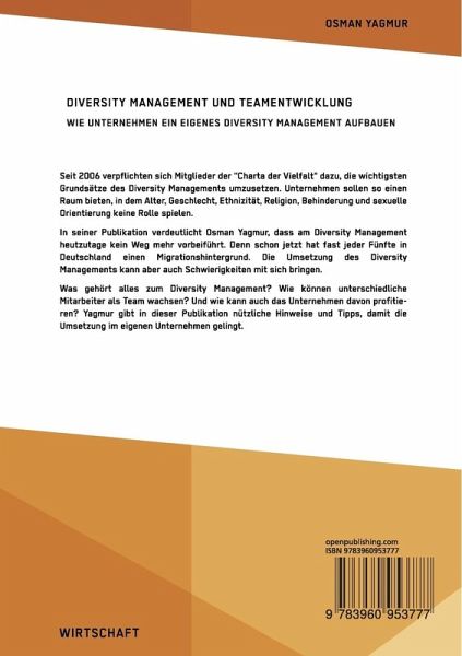 Seit 2006 verpflichten sich Mitglieder der "Charta der Vielfalt" dazu, die wichtigsten Grundsätze des Diversity Managements umzusetzen. Unternehmen sollen so einen Raum bieten, in dem Alter, Geschlecht, Ethnizität, Religion, Behinderung und sexuelle Orientierung keine Rolle spielen.In seiner Publikation verdeutlicht Osman Yagmur, dass am Diversity Management heutzutage kein Weg mehr vorbeiführt. Denn schon jetzt hat fast jeder Fünfte in Deutschland einen Migrationshintergrund. Die Umsetzung des Diversity Managements kann aber auch Schwierigkeiten mit sich bringen.Was gehört alles zum Diversity Management? Wie können unterschiedliche Mitarbeiter als Team wachsen? Und wie kann auch das Unternehmen davon profitieren? Yagmur gibt in dieser Publikation nützliche Hinweise und Tipps, damit die Umsetzung im eigenen Unternehmen gelingt.Aus dem Inhalt:- Diskriminierung;- Integration;- Vielfalt;- Gleichberechtigung;- Teambuilding