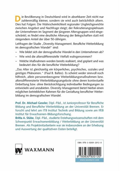 Die Bevölkerung in Deutschland wird in absehbarer Zeit nicht nur zahlenmäßig kleiner, sondern sie wird auch beträchtlich altern. Dies hat Folgen: Die Wahrscheinlichkeit regionaler Ungleichgewichte zwischen Angebot und Nachfrage steigt; der Rekrutierungsspielraum der Unternehmen im Segment der jüngeren Altersgruppen wird eingeschränkt; es findet eine deutliche Alterung der Belegschaften statt mit steigendem Anteil der über 50-Jährigen.Leitfragen der Studie "Diversity Management. Berufliche Weiterbildung im demografischen Wandel" sind:- Wie bildet sich der demografische Wandel in den Unternehmen ab?- Wie wird die altersdifferenzielle Vielfalt wahrgenommen?- Welche Maßnahmen werden bereits realisiert, sind geplant und was bedeutet dies für die berufliche Weiterbildung?"Das Alter ist gleichzeitig ein körperliches, psychisches, soziales und geistiges Phänomen." (Paul B. Baltes). Es scheint weder sinnvoll noch hilfreich, allein personenbezogene Weiterbildungsmaßnahmen bzw. altersdifferenzierte Weiterbildungsangebote ohne deren kontextuelle Einbettung bzw. ohne Berücksichtigung individueller Bedingungen zu entwickeln und anzubieten. Diversity Management bietet hierbei eine mögliche betriebliche Rahmung für die Gestaltung beruflicher Weiterbildung im demografischen Wandel.