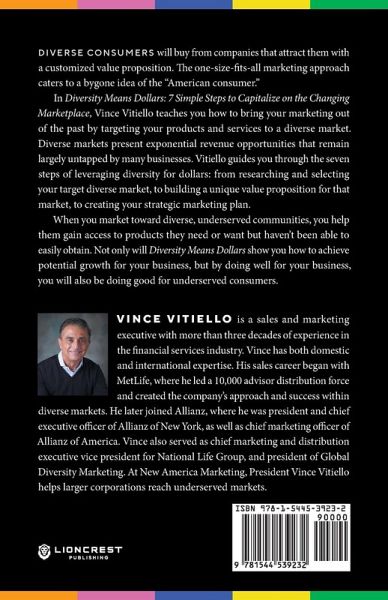 Diverse consumers will buy from companies that attract them with a customized value proposition. The one-size-fits-all marketing approach caters to a bygone idea of the "American consumer." In Diversity Means Dollars: 7 Simple Steps to Capitalize on the Changing Marketplace, Vince Vitiello teaches you how to bring your marketing out of the past by targeting your products and services to a diverse market. Diverse markets present exponential revenue opportunities that remain largely untapped by many businesses. Vitiello guides you through the seven steps of leveraging diversity for dollars: from researching and selecting your target diverse market, to building a unique value proposition for that market, to creating your strategic marketing plan. ¿ When you market toward diverse, underserved communities, you help them gain access to products they need or want but haven't been able to easily obtain. Not only will Diversity Means Dollars show you how to achieve potential growth for your business, but by doing well for your business, you will also be doing good for underserved consumers.