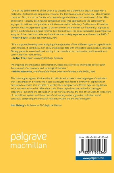 This book defends the idea that there are significant structural and institutional differences between the countries in Latin America. Building off the results of a four-year research project, Bizberg argues against the idea that in Latin America there is one single type of capitalism-a hierarchical one-that is entangled in a vicious cycle. Rather, there are clusters of countries that have had similar historical trajectories, analogous structures, or comparable reactions to changes to the world economy, but have not all followed the same mode of development. Just as analysts have found a variety of capitalisms in developed countries, it is possible to identify the emergence of different types of capitalism in Latin America since the 1980s debt crisis. These varieties of capitalism are defined according to categories-including the articulation to the world economy, the role of the State, the structure of the political system and the action of civil society-which give rise to distinct wage relations, comprising the industrial relations system and the welfare regime.