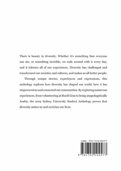 There is beauty in diversity. Whether it's something that everyone can see, or something invisible, we walk around with it every day, and it informs all of our experiences. Diversity has challenged and transformed our societies and cultures, making us all better people. Through unique stories, experiences and expressions, this anthology explores how diversity has shaped our world, how it has empowered us and connected our communities. By exploring numerous experiences, from partying at Mardi Gras to being unapologetically Arabic, the 2019 Sydney University Student Anthology shows that diversity unites and enriches our lives.