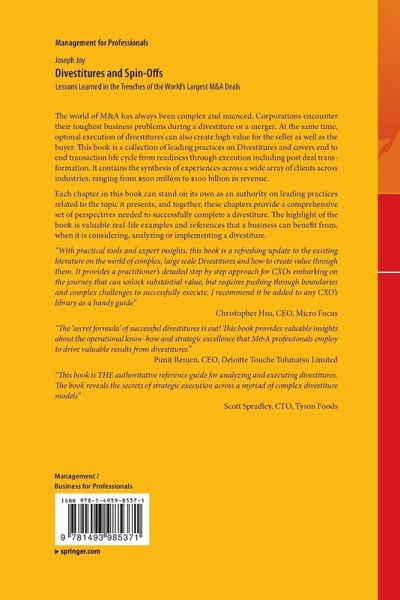 Each chapter in this book can stand on its own as an authority on leading practices related to the topic it presents, and together, these chapters provide a comprehensive set of perspectives needed to successfully complete a divestiture. The highlight of the book is valuable real-life examples and references that a business can benefit from, when it is considering, analyzing or implementing a divestiture.