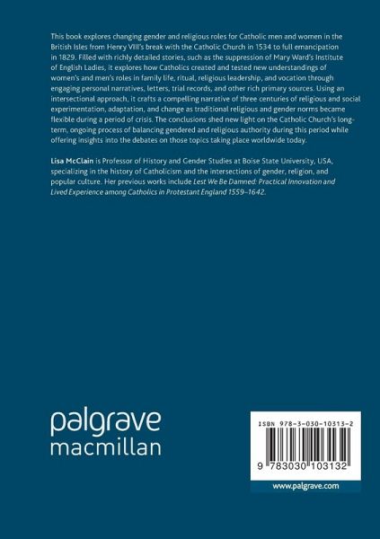 This book explores changing gender and religious roles for Catholic men and women in the British Isles from Henry VIII's break with the Catholic Church in 1534 to full emancipation in 1829. Filled with richly detailed stories, such as the suppression of Mary Ward's Institute of English Ladies, it explores how Catholics created and tested new understandings of women's and men's roles in family life, ritual, religious leadership, and vocation through engaging personal narratives, letters, trial records, and other rich primary sources. Using an intersectional approach, it crafts a compelling narrative of three centuries of religious and social experimentation, adaptation, and change as traditional religious and gender norms became flexible during a period of crisis. The conclusions shed new light on the Catholic Church's long-term, ongoing process of balancing gendered and religious authority during this period while offering insights into the debates on those topics taking place worldwide today.