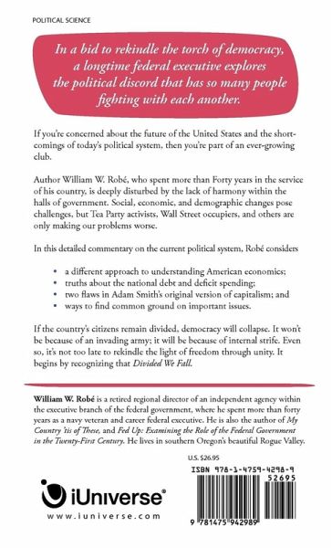 In a bid to rekindle the torch of democracy, a longtime federal executive explores the political discord that has so many people fighting with each another. ¿ truths about the national debt and deficit spending; ¿ two flaws in Adam Smith's original version of capitalism; and ¿ ways to find common ground on important issues. If the country's citizens remain divided, democracy will collapse. It won't be because of an invading army; it will be because of internal strife. Even so, it's not too late to rekindle the light of freedom through unity. It begins by recognizing that Divided We Fall.