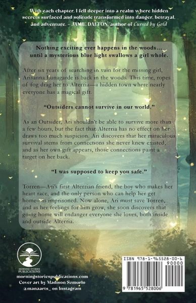 Nothing exciting ever happens in the woods... until a mysterious blue light swallows a girl whole. After six years of searching in vain for the missing girl, Arisanna Lunagarde is back in the woods. This time, ropes of fog drag her to Alterria-a hidden town where nearly everyone has a magical gift. "Outsiders cannot survive in our world." As an Outsider, Ari shouldn't be able to survive more than a few hours, but the fact that Alterria has no effect on her draws too much suspicion. Ari discovers that her miraculous survival stems from connections she never knew existed, and as her own gift appears, those connections paint a target on her back. "I was supposed to keep you safe." Torren-Ari's first Alterrian friend, the boy who makes her heart race, and the only person who can help her get home-is imprisoned. Now alone, Ari must save Torren, and as her feelings for him grow, she soon discovers that going home will endanger everyone she loves, both inside and outside Alterria.
