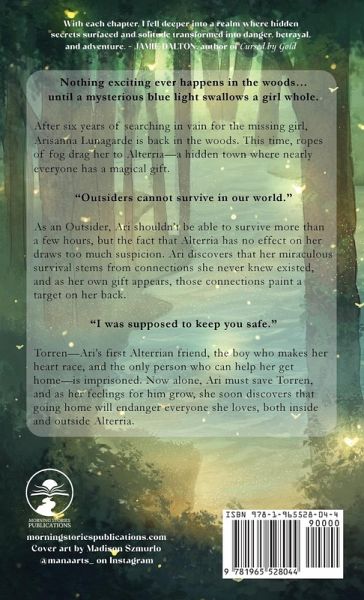 Nothing exciting ever happens in the woods... until a mysterious blue light swallows a girl whole. After six years of searching in vain for the missing girl, Arisanna Lunagarde is back in the woods. This time, ropes of fog drag her to Alterria-a hidden town where nearly everyone has a magical gift. "Outsiders cannot survive in our world." As an Outsider, Ari shouldn't be able to survive more than a few hours, but the fact that Alterria has no effect on her draws too much suspicion. Ari discovers that her miraculous survival stems from connections she never knew existed, and as her own gift appears, those connections paint a target on her back. "I was supposed to keep you safe." Torren-Ari's first Alterrian friend, the boy who makes her heart race, and the only person who can help her get home-is imprisoned. Now alone, Ari must save Torren, and as her feelings for him grow, she soon discovers that going home will endanger everyone she loves, both inside and outside Alterria.
