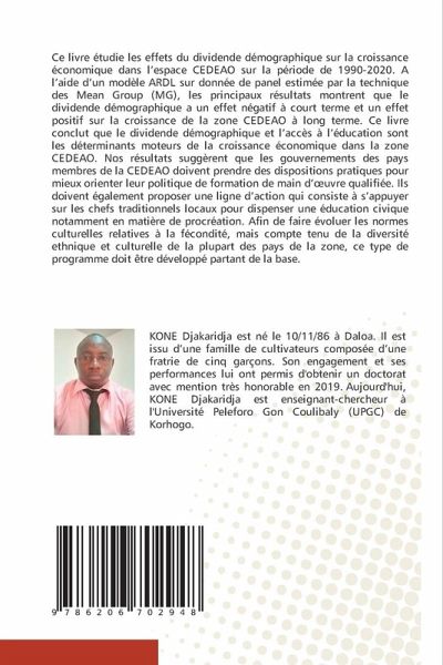 Ce livre étudie les effets du dividende démographique sur la croissance économique dans l'espace CEDEAO sur la période de 1990-2020. A l'aide d'un modèle ARDL sur donnée de panel estimée par la technique des Mean Group (MG), les principaux résultats montrent que le dividende démographique a un effet négatif à court terme et un effet positif sur la croissance de la zone CEDEAO à long terme. Ce livre conclut que le dividende démographique et l'accès à l'éducation sont les déterminants moteurs de la croissance économique dans la zone CEDEAO. Nos résultats suggèrent que les gouvernements des pays membres de la CEDEAO doivent prendre des dispositions pratiques pour mieux orienter leur politique de formation de main d'oeuvre qualifiée. Ils doivent également proposer une ligne d'action qui consiste à s'appuyer sur les chefs traditionnels locaux pour dispenser une éducation civique notamment en matière de procréation. Afin de faire évoluer les normes culturelles relatives à la fécondité, mais compte tenu de la diversité ethnique et culturelle de la plupart des pays de la zone, ce type de programme doit être développé partant de la base.
